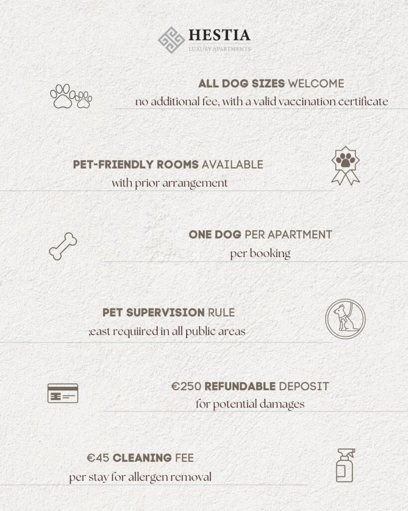 At Hestia Luxury Apartments, we believe that your pet deserves to enjoy the city as much as you do. That’s why we’ve created a thoughtfully designed pet-friendly experience in the heart of Athens — where comfort meets companionship.